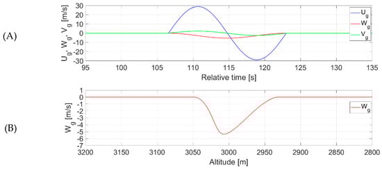 The variation in gust values along the airplane’s longitudinal axis (ug) and vertical axis (wg) is reflected in the longitudinal motion, as shown in Equation (1), while changes in gust values along the lateral axis (vg) appear in the lateral motion in Equation (2). The gust parameters (ug, wg, vg) are included in the disturbance vectors Zlon and Zlat (4), respectively.