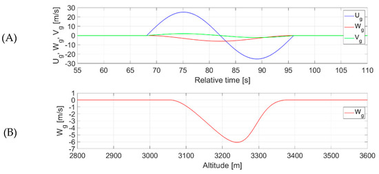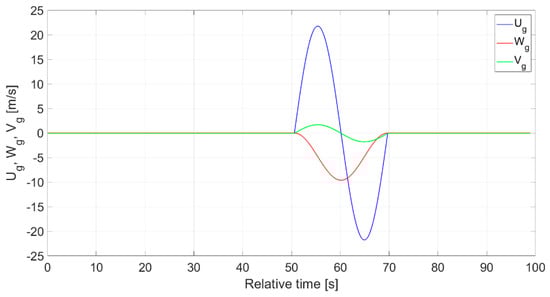 The amplitudes of simulated gusts used in the tests were determined (taking into account the limitations of the simulation environment) based on empirical data and documented reports [46,47]. Peak values of headwind changes or downdrafts may slightly exceed the design gust envelopes defined in CS-25 and FAR 25 [48,49], but they remain valid for simulating extreme transient events. The gust amplitudes used in the simulations are considered physically plausible and appropriate for modeling extreme yet credible scenarios—particularly those associated with terrain-induced gusts, thunderstorms, or microburst conditions.