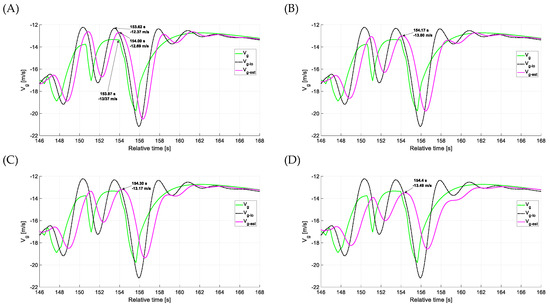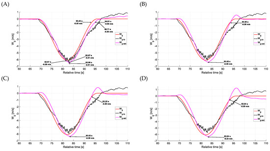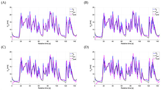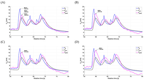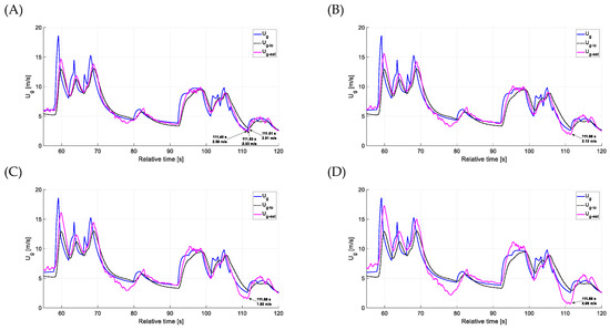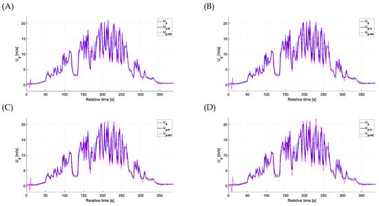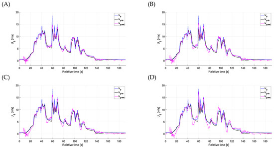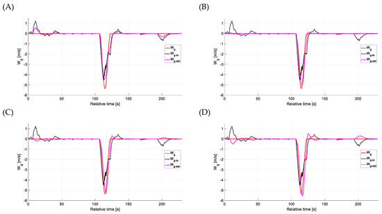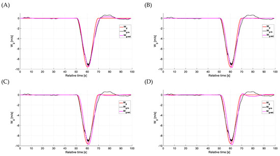 Comparison of the gust value with the estimation results—microburst during a level flight; entire simulation (complementary filter, (A) Tcw = 0.5 s, (B) Tcw = 1.0 s, (C) Tcw = 1.2 s, (D) Tcw = 1.5 s).
