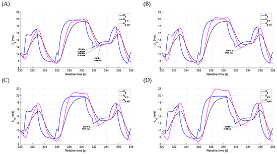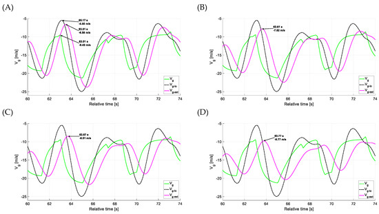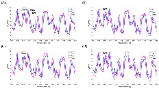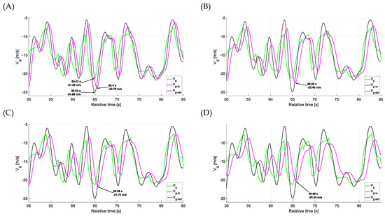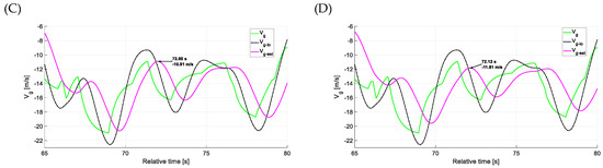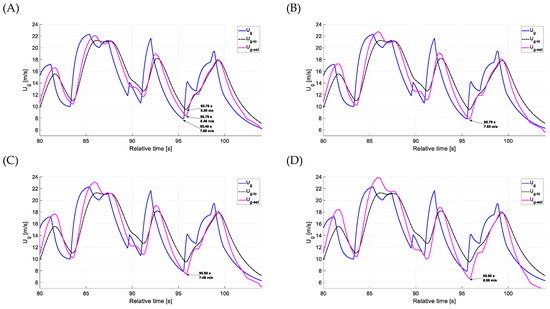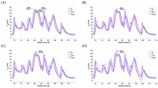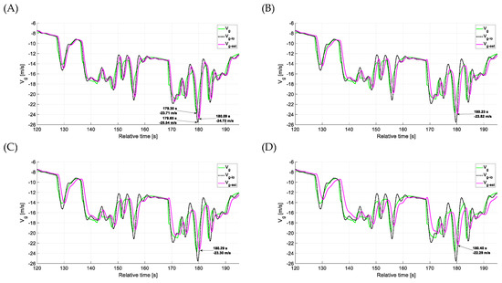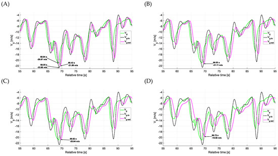Comparison of the gust value with the estimation results—climb crossing a gust area; series of selected gusts (complementary filter, (A) Tcv = 0.5 s, (B) Tcv = 0.8 s, (C) Tcv = 1.0 s, (D) Tcv = 1.5 s).