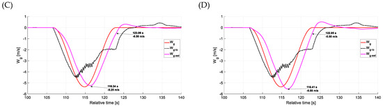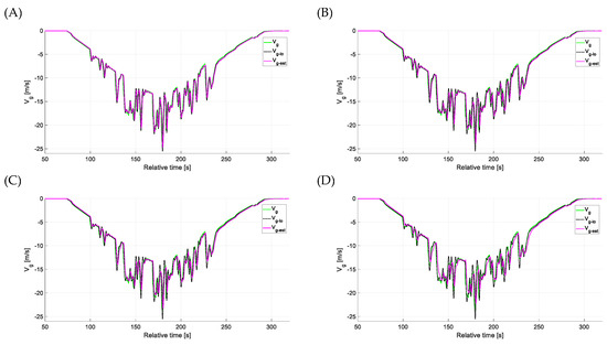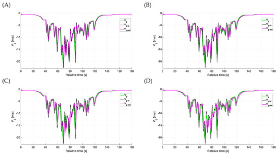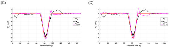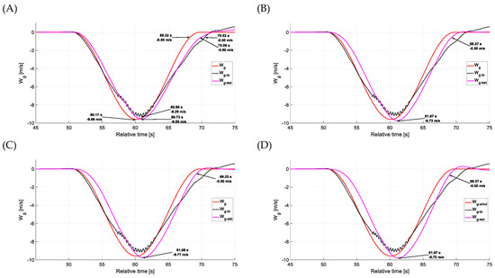 Comparison of the gust value with the estimation results—descent crossing a microburst; single vertical gust (complementary filter, (A) Tcw = 0.5 s, (B) Tcw = 1.0 s, (C) Tcw = 1.2 s, (D) Tcw = 1.5 s).