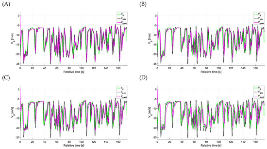 Comparison of the gust value with the estimation results—descent crossing a microburst; entire simulation (complementary filter, (A) Tcw = 0.5 s, (B) Tcw = 1.0 s, (C) Tcw = 1.2 s, (D) Tcw = 1.5 s).
