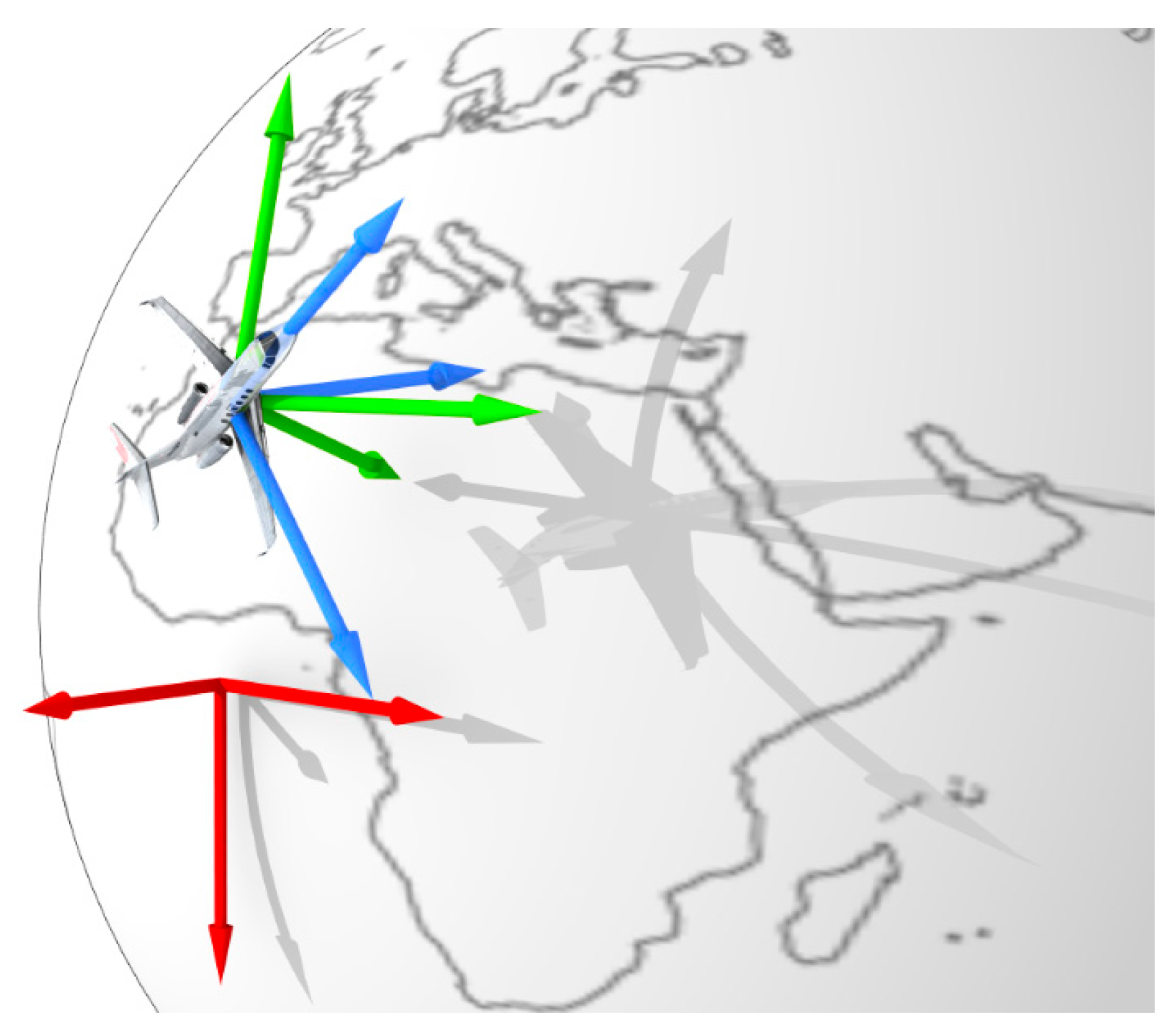Coordinate systems: OpenGL—related to the Earth (red), fixed to the center of gravity of the aircraft (green), related to the plane (blue).