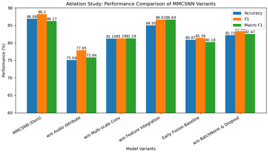 Effect of audio attribute subsets and individual feature removal on MMCSNN performance. Bold values indicate the best results in each column.