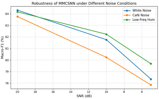 As shown in Figure 8, the MMCSNN still performs well under all the noise conditions. Even at 5 dB, the Macro F1-score remains above 77%. It is worth noting that, starting from 10 dB, white noise caused a significant performance drop. This may be due to its broad spectral coverage, which can interfere with the extraction of audio attribute features.