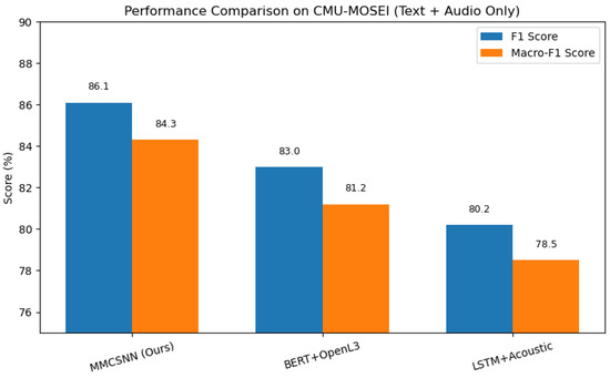 To assess whether the MMCSNN can generalize beyond its original training distribution, we evaluate its performance on the CMU-MOSEI dataset. While CMU-MOSEI includes visual signals, only the text and audio modalities are used here to stay consistent with our model’s design, which excludes visual input in favor of streamlined bimodal processing.