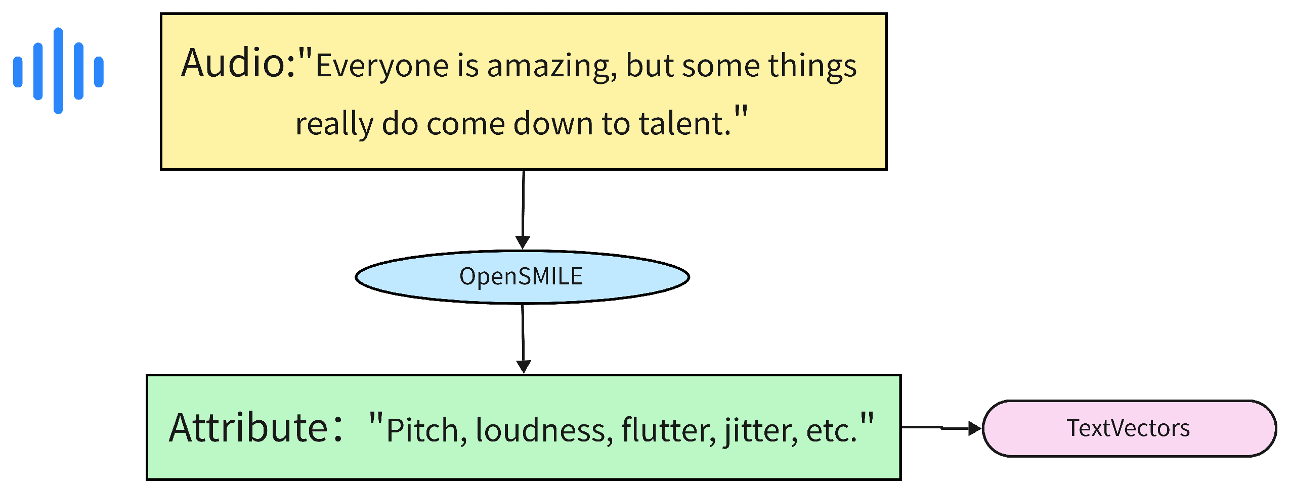 To address these challenges, this paper presents a solution that utilizes critical audio information as attributes for text, enhancing the continuity between text and audio through effective text feature extraction methods, as illustrated in Figure 1. In this framework, OpenSMILE, an open-source toolkit for extracting acoustic features such as pitch, loudness, and jitter, is utilized to process raw audio signals into structured attribute representations.