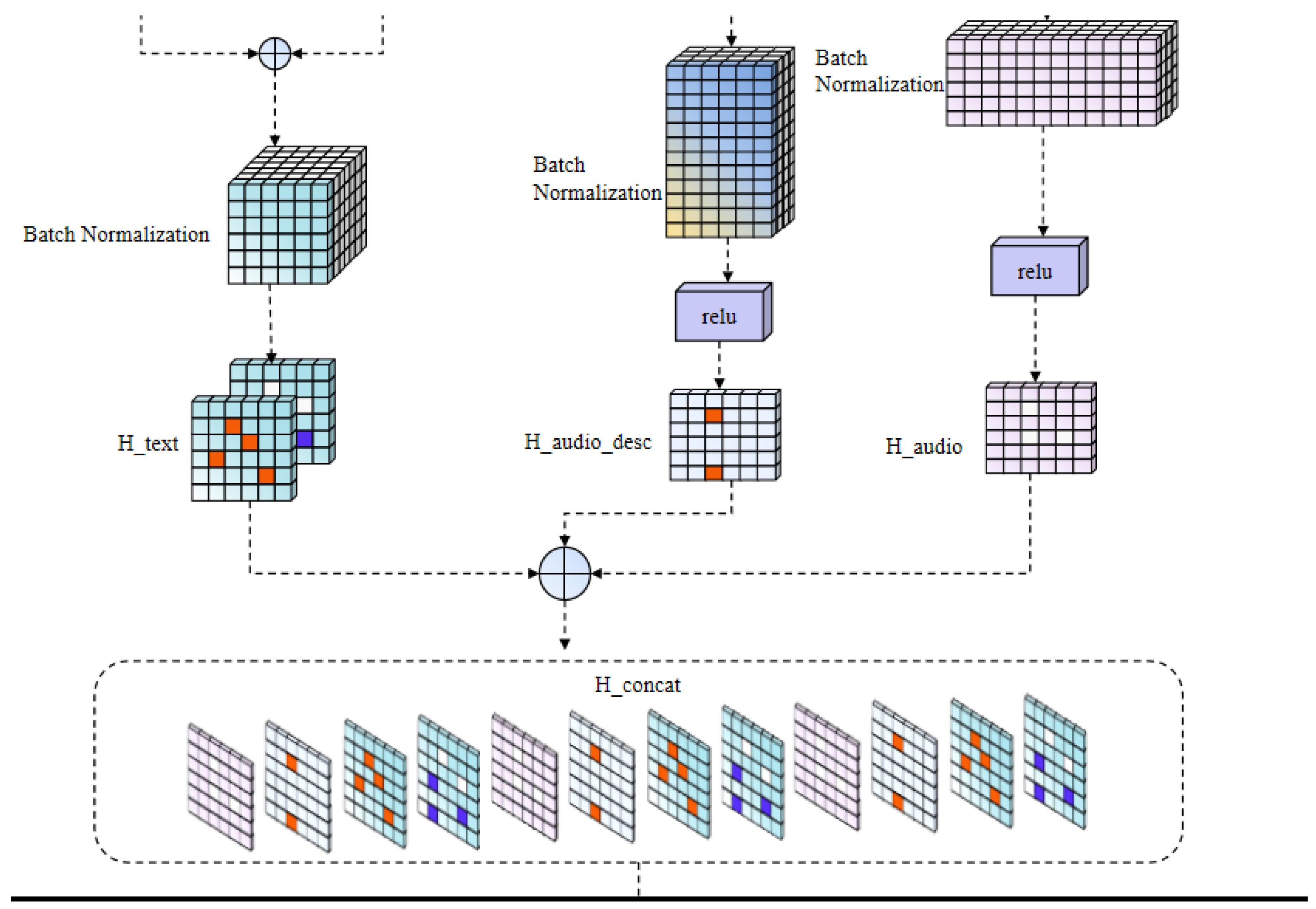 To facilitate downstream multimodal fusion, the output of the BERT encoder is further refined through a batch normalization and activation layer, and subsequently projected to a fixed dimensionality of 128 via a linear transformation. The resulting audio-attribute embedding vector, denoted as , is 128-dimensional and serves as the final representation used in cross-modal integration.