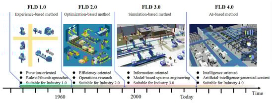 To systematically catch the evolutionary trends in FLD, we propose a structured paradigm framework for FLD. This framework categorizes and delineates the key phases, methodologies, and technological advancements that have influenced FLD over time. As illustrated in Figure 1 and Table 1, the evolution can be categorized into four distinct paradigms: manual and rule-of-thumb approaches (FLD 1.0), the operations research paradigm (FLD 2.0), simulation-based systems engineering (FLD 3.0), and the emerging generative-AI-enabled method (FLD 4.0). This evolution reflects the broader trends in industrial development from the early days of mechanization in Industry 1.0 to the interconnected, smart manufacturing ecosystems of Industry 4.0.