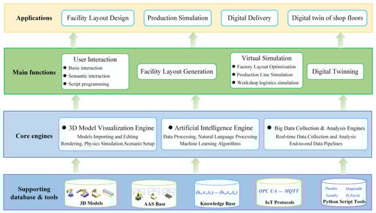As shown in Figure 2, the proposed FLD 4.0 architecture consists of four key layers: the supporting database and tools, core engine, main functions, and applications. This architecture emphasizes semantic interoperability, utilizing the AAS as a robust semantic framework for asset management. The AAS provides standardized descriptions of equipment and processes, enabling seamless integration across various systems and platforms in an Industry 4.0 context []. The structured ontology knowledge map based on AAS offers rich insights into asset relationships and operational processes. Additionally, the domain knowledge base, grounded in a large semantic model and advanced knowledge engineering practices, ensures contextual layout relevance and adaptability [,]. The core engines comprise advanced components such as 3D visualization, artificial intelligence data processing, and big data analytics. These elements work in tandem to facilitate real-time monitoring and decision making based on current operational conditions. The main functions encompass user-centric features that enhance interactivity, including layout generation, virtual simulation, and digital pairing. The user interface incorporates feedback mechanisms to continuously refine the output based on user input, ensuring that the design meets practical needs. The application layer focuses on comprehensive solutions for facility layout design, production simulation, digital delivery, and the creation of dynamic digital twins. These digital twins not only mirror physical assets but also integrate real-time data inputs to predict performance and guide operational optimization effectively.