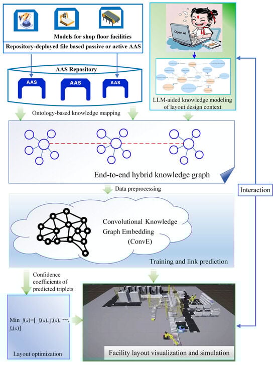Integrating knowledge maps based on AAS and LLMs forms a mixed knowledge map tailored for complex, scene-oriented facility layout design. This approach facilitates end-to-end, multi-scale semantic information integration, connecting diverse data sources to the planner’s design intentions. By continuously incorporating new knowledge through user interaction and model fine-tuning, the system evolves to address dynamic operational requirements. Finally, convolutional knowledge graph embedding (ConvE) model is employed for graph embedding transformations, converting complex relationships in shop-floor layout design into actionable low-dimensional vector representations [], which enable chain forecasting tasks for the specific selection and generation of workshop layouts; the resulting layout generation is then showcased through a visualization engine. The main implementation details are introduced in the following subsections.