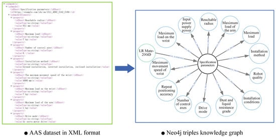 Specifically, the script extracts the submodel and property nodes from the XML files, which represent the entities of the assets. Each asset’s unique identifier is treated as an entity in the knowledge graph, creating a standardized digital representation. During the parsing process, the script also extracts RelationshipElements, which include the start and end points of relationships as well as the relationship type. These relationship elements represent the physical or data dependencies between the assets and form the edges in the knowledge graph. By analyzing the logical connections between assets, the interconnectivity of the assets is transformed into structured relationship information in the graph, enriching the semantic content of the knowledge graph. The extracted entities and relationships are mapped as triples and stored in a graph database, such as Neo4j. In addition, Neo4j’s graphical visualization capabilities allow the knowledge graph to be presented in an intuitive way, enabling users to interact dynamically with the assets and relationships. This facilitates deeper analysis and enhances the intelligent decision-making process.