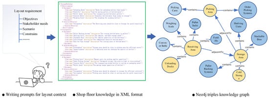 Mining the semantic information of the AAS only to establish a knowledge base not effectively drives the generation of a comprehensive workshop facility layout, and a background knowledge base or an expert knowledge base aligned with task requirements is essential. In this context, pre-trained large language models can be employed to construct or refine this background knowledge map, specifically tailored for layout tasks. As illustrated in Figure 6, utilizing LLMs such as ChatGPT (https://openai.com/index/chatgpt/, accessed on 16 May 2025), structured prompts can streamline the design process for facility layout planning in smart factories []. This prompt guides planners to identify critical components, including machinery, workstations, and storage areas, while also considering workflows, spatial requirements, and future scalability [,,]. Subsequently, the relevant shop-floor layout knowledge may be represented in XML or JSON format, detailing the dimensions and locations of various elements alongside a workflow sequence that encompasses material receipt through to finished-product storage. Furthermore, graph databases such as Neo4j offer an effective means of modeling the relationships between various shop-floor components, facilitating the efficient querying of operational connections.