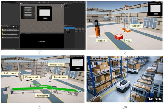 Figure 8 demonstrates a basic case of generating a layout of a logistics storage workshop. By inputting the text of the layout requirements in the system’s GUI (Figure 8a), the system produces editable 3D layout scenes, as shown in Figure 8b,c. This process allows for quick iterations and the visual representation of complex design concepts, enabling users to adjust and refine the layout based on real-time feedback. Recently, artificial-intelligence-generated content (AIGC) has been gaining significant attention and experiencing exponential growth []. The AIGC platform Doubao (https://www.doubao.com/chat/, accessed on 16 May 2025) generates a visual scene image based on the same prompts. Undoubtedly, the generative-AI-enabled facility layout design is no longer a dream but is now feasible. As the system continues to improve, the potential for AI-powered facility layout design (FLD 4.0) will be immense. It will likely revolutionize how layouts are planned and optimized, offering faster, more efficient, and creative solutions that reduce human error and increase productivity.