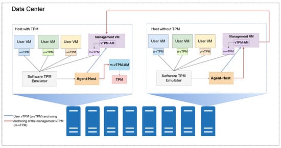 In the proposed hyperconverged anchoring system, there are two types of hosts: hosts with TPMs and hosts without TPMs. Each of these hosts can host multiple user VMs, each with its own u-vTPM. The hosts must also have a management VM (m-VM), enabling the integration of the solution with one of the main architectures used in hyperconverged infrastructures [