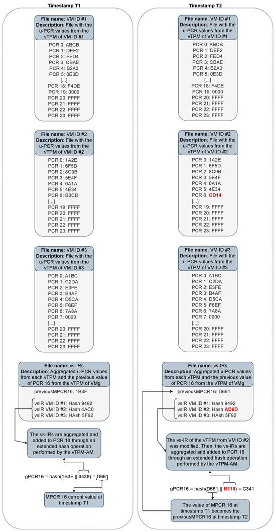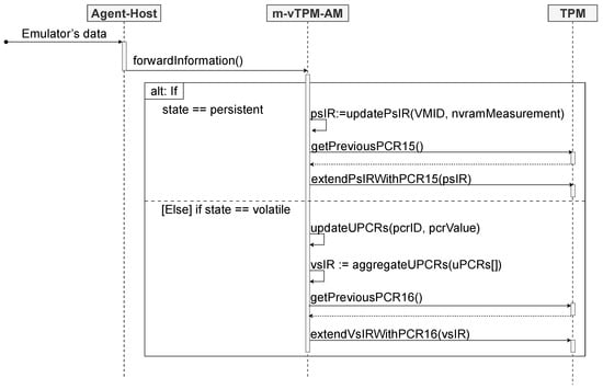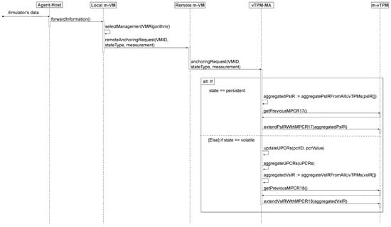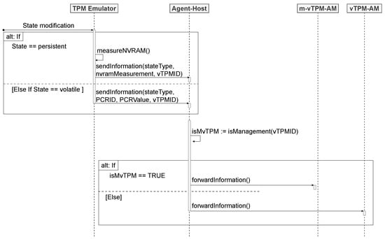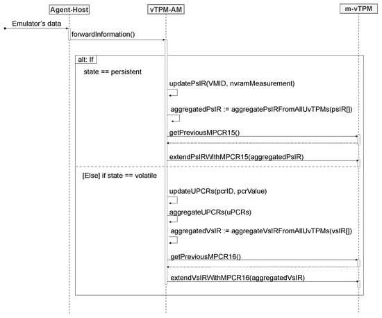 Figure 4, a sequence diagram is shown that represents the interaction between the emulator and the Agent–Host. If the modification results from the persistent state, the emulator measures the NVRAM file of the vTPM and sends these data to the Agent–Host. In case of changes in the volatile state, indicating modifications in the PCRs of the vTPM, the emulator informs the Agent–Host of the details regarding the number and current value of the affected PCR. Furthermore, each set of information sent to the Agent–Host includes the specification of the state type (volatile or persistent) and the identification of the VM that had its vTPM modified (VMID). Thus, the Agent–Host evaluates the origin of the measurement, determining whether it comes from a u-vTPM or m-vTPM.