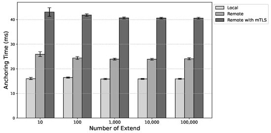 Figure 9 presents the average anchoring times estimated with 95% confidence. In all the analyzed scenarios, an increase in anchoring time is observed when anchoring is performed remotely. For instance, in the scenario with 100,000 extends, an increase in anchoring time between 7.62 ms and 8.48 ms was observed when compared to local anchoring. Additionally, the use of remote anchoring with mTLS resulted in an increase between 24.22 ms and 25.00 ms relative to local anchoring.