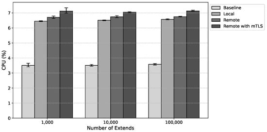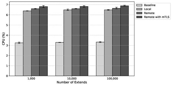 Figure 11 present the estimated values for average CPU usage, corresponding to Host 1 and Host 2, respectively. The results suggest a slight increase in CPU utilization. Compared to local anchoring, under a load of 100,000 extends, there was an average increase of 0.18 percentage points for remote anchoring and 0.56 for remote anchoring with mTLS. These results indicate that the proposed solution has a minimal impact on CPU usage.
