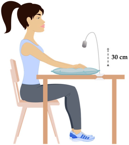 All procedures were approved by the local Ethics Committee of the Faculty of Pharmacy (no. 11/2024). The procedures were carried out in a room with controlled temperature and humidity conditions (24 ± 1 °C; 40–60%). The room had moderate ambient lighting, which remained constant throughout the procedure. To avoid potential interference with the active near-infrared illumination system of the imaging device, no external infrared sources or natural sunlight were present during data acquisition. Skin temperature is known to influence superficial vein diameter [30]. However, room temperature was maintained constant, and no significant intra-individual variation in skin temperature was observed during the protocol. Subjects were lightly clothed, sitting upright with back support and with both feet flat on the floor (Figure 1). Both arms were supported at heart level to eliminate the hydrostatic effect. A pneumatic cuff was fitted around a randomly chosen arm, approximately 2 cm above the elbow. A baseline recording was made for 5 min (phase I—baseline), after which the cuff was rapidly (<10 s) inflated to 200 mmHg for 3 min (phase II—occlusion). Finally, the cuff was rapidly deflated, and the recording was maintained for a further 5 min (phase III—recovery).