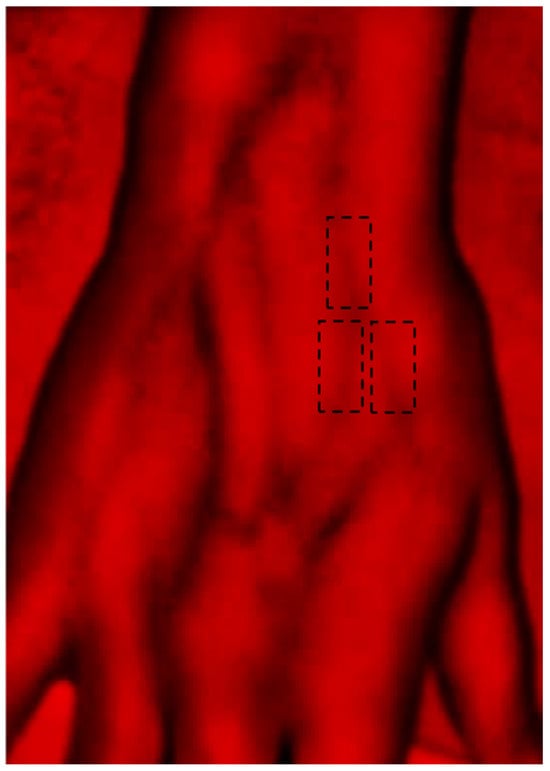 The video files of the participants were decomposed into individual frames using Matlab R2015a (MathWorks, Natick, MA, USA). Given the high anatomical variability in the number, size, and arrangement of superficial veins on the dorsal hand, a standardized and systematic approach to region of interest (ROI) selection was adopted. In each participant, three clearly visible dorsal metacarpal veins were identified, along with two associated tributary veins. For each of these veins, a rectangular ROI was manually selected in every frame, resulting in a total of 126 ROIs analyzed across the dataset (Figure 2). In each ROI, the width perpendicular to the vein axis was manually measured using ImageJ software (version 1.54g; National Institutes of Health, Bethesda, MD, USA) at seven predefined time points: three times during baseline (minutes 1, 3, and 5), twice during occlusion (minutes 6 and 7), and three times during recovery (minutes 9, 11, and 13). These time points were selected to capture representative phases of the protocol. Each ROI was converted to a grayscale image, from which a set of textural parameters was extracted, namely contrast, correlation, energy, homogeneity, and entropy, as well as fractal dimension and lacunarity. No pre-processing of images was performed before assessing textural parameters. Texture features were extracted from grayscale ROIs using standard gray-level co-occurrence matrix (GLCM) methodology. The co-occurrence matrices were normalized as probability distributions, but no normalization of grayscale intensity values was applied to the input ROIs prior to texture analysis. The spatial resolution of the images was estimated at approximately 0.15 mm/pixel, based on calibration using a reference object within the imaging field. This resolution was consistent across all frames and participants due to the fixed position of the imaging system. All analyses were conducted on rectangular ROIs of identical pixel dimensions, manually positioned using consistent anatomical landmarks to ensure reproducibility and minimize variability due to lighting or movement.