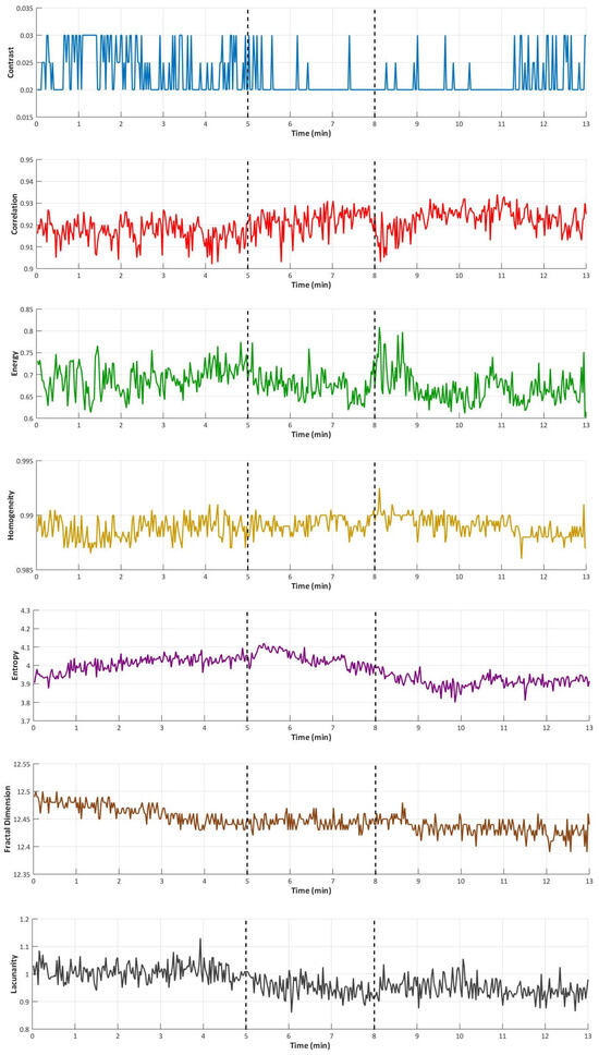 Median values of textural parameters extracted from the regions of interest in near-infrared vein images over time. Parameters include contrast (blue), correlation (red), energy (green), homogeneity (yellow), entropy (purple), fractal dimension (brown), and lacunarity (grey). Dashed vertical lines indicate the beginning and end of suprasystolic occlusion (minute 5 to minute 8).