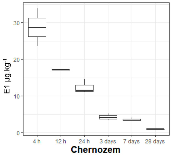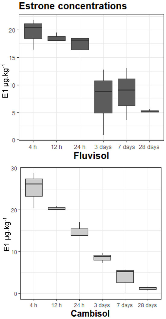 The soils showed a significant difference in estrone concentrations between the start and the end of the experiment, with chernozem presenting the highest variation (from 28.71 μg·kg−1 to 0.94 μg·kg−1), and fluvisol presenting the lowest (from 20.48 μg·kg−1 at 4 h to 5.09 μg·kg−1 at 28 days). At the same time, fluvisol had the highest median, 13.93 μg·kg−1, and the clearest transition in the phases of estrone at 24 h; chernozem had the lowest median (8.10 μg·k−1) and presented several transition phases (4 h to 12 h, 24 h to 3 days, and the last one between 7 and 28 days), while cambisol showed no significant differences between consecutive sampling times.