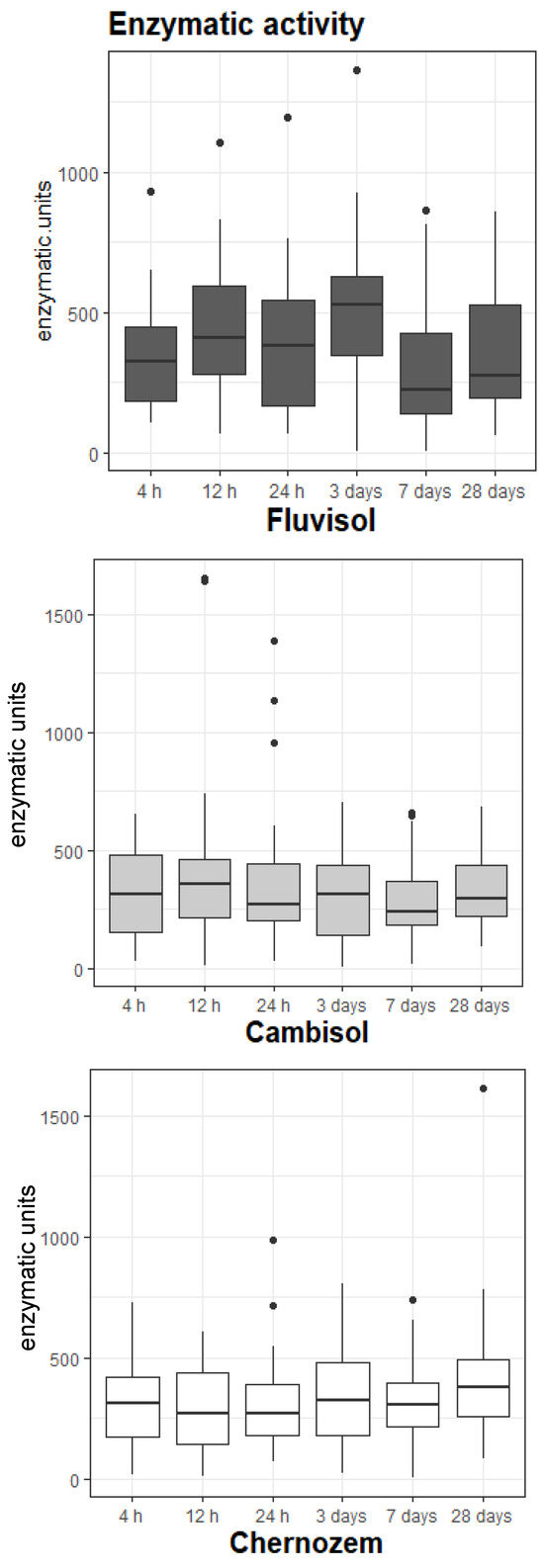 Overall, fluvisol had the highest median activity (371 U), followed by chernozem (308 U) and cambisol (296 U). On the other hand, cambisol presented the biggest variation in its values, registering the highest individual enzymatic measurement throughout the experiment (1652 U) (Table 2—Enzymatic activity values at each sampling time show differences in and between soils).