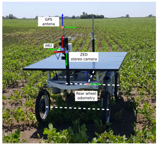 The Rosario dataset was collected using a mobile robot (Figure 2) designed for outdoor agricultural environments [12]. The robot was equipped with a TARA stereo-inertial sensor (LSM6DS0 IMU), operating at a frequency of 140 Hz. For global localization, the system includes a GPS-RTK Emlid Reach module, operating at a frequency of 5 Hz. A ZED stereo camera was also mounted on the robot to collect synchronized left and right images at a resolution of 672 × 376 px and at a frame rate of 15 Hz.