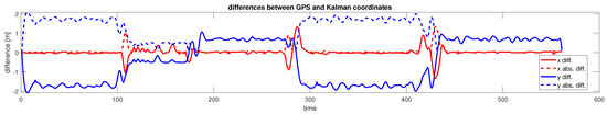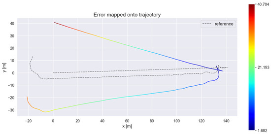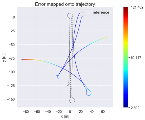 The motivation for using position correction models (in relation to the values resulting from odometry alone) was the observation that, based only on odometry, we obtained significant differences between the actual (GPS) and estimated (odometry) positions. The size of these differences is shown in Figure 5 and Figure 6—they correspond to the first and fifth courses from the Rosario data; the dashed line is the actual course according to GPS, and the continuous line is the course resulting from the odometry data. The color of the continuous line reflects the difference in positions (from blue as small error to red as large error).