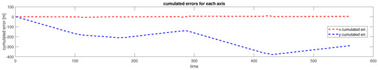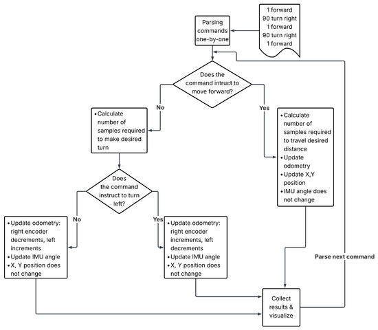 In these formulas, the change in the angle of position of the robot is calculated on the basis of the distance covered by the wheels over a time interval. In the event of slippage, the distances covered by the wheels will be distorted, which will also distort the change in angle. Instead of determining based on the distance covered by the wheels, it was decided to determine based on the IMU sensor readings. In the event of slippage, the robot’s movement angle will be maintained, and only the distance will be distorted, which is acceptable in the case of small distances covered by the robot between successive samples. This is particularly important when the robot turns. This is an additional safeguard in the event that the slippage detection module does not detect slippage.