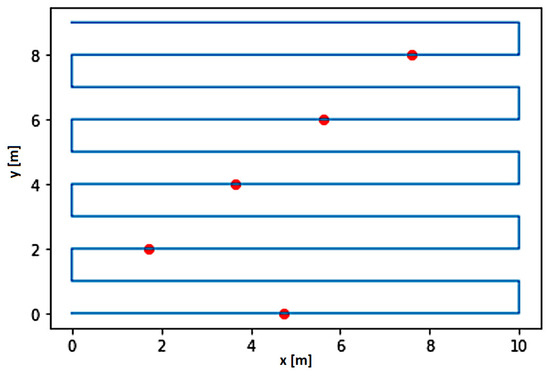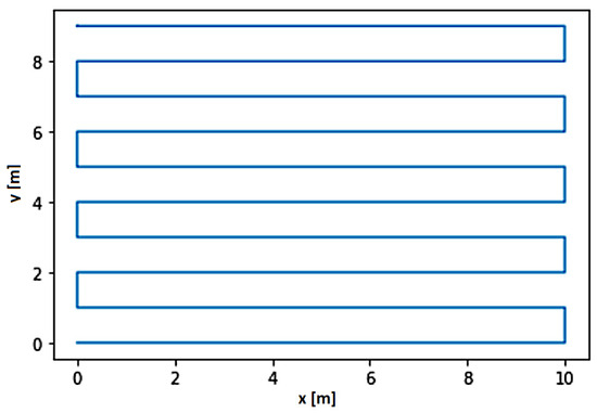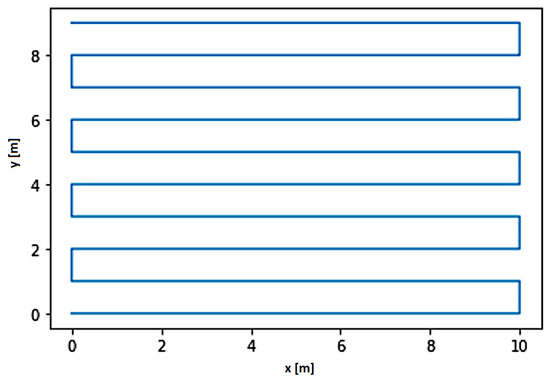 As mentioned, the data include six runs with a total length of 2296.93 m, completed in 34.7 min. The first run was in the north–south direction, while the rest, according to the suggested robot movement pattern, was in the east–west direction. The summary of the length and duration of each run is presented in Table 1. The actual course of each run is shown in Figure 3 and Figure 4.