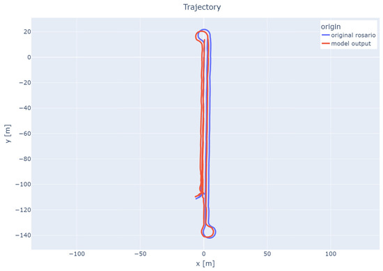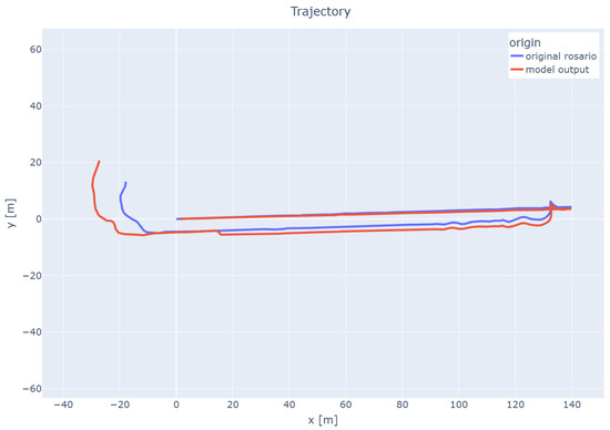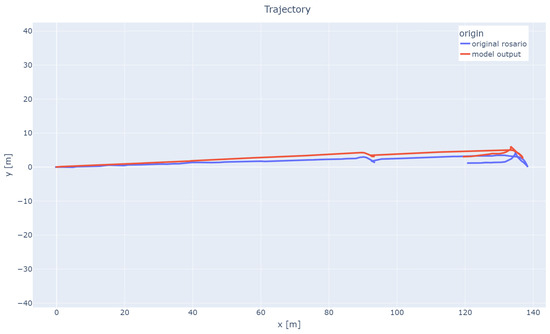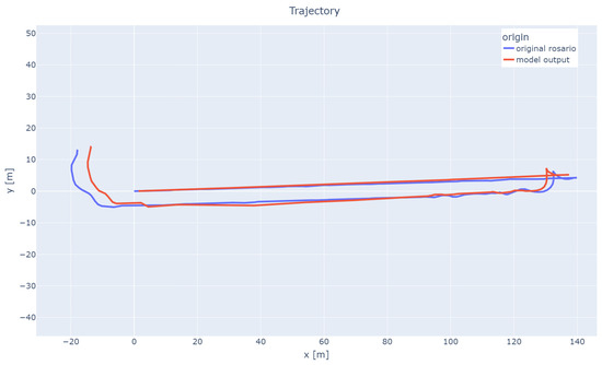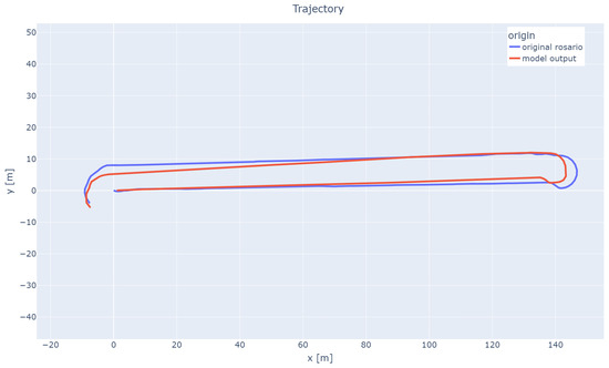 Based on the prepared neural network models, predictions of the robot’s travel routes were made on the basis of odometry data and data from IMU sensors. The following Figure 17, Figure 18 and Figure 19 show the selected predicted travel routes (without an additional navigation signal in the input data) together with the actual route determined based on GPS data. The route determined based on GPS data is marked in blue, while the predicted travel route is marked in red.