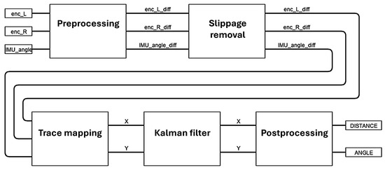 Ultimately, a robot positioning algorithm was created based on odometry data and IMU sensor data using the classical method, that is, using formulas defining robot displacements based on data from these sensors. Additionally, in addition to determining the robot position based on appropriate calculations, the algorithm was enriched with a module to preprocess measurement signal data to protect the solution against unusual situations and a module to remove slippages. The algorithm also uses a Kalman filter, which allows for estimating the robot position based on data that may be burdened with error. The algorithm scheme is shown in Figure 20.