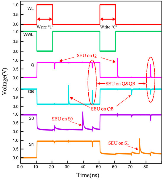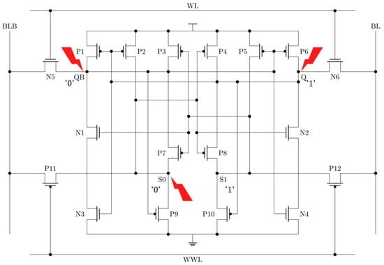 When a high-energy particle strikes an NMOS, a negative current is generated. This can induce a 0-to-0 or 1-to-0 upset. In the case of a PMOS, a positive current is generated, which can induce a 1-to-1 or 0-to-1 upset. When the RHLP-18T cell stored at logic 1, nodes Q, QB, and S0 are considered sensitive nodes because a 1-to-0 upset or 0-to-1 upset can occur as shown in Figure 1. The RHLP-18T cell includes mechanisms to recover from single-node upsets caused by particle strikes hitting sensitive nodes.
