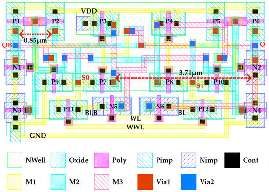 This section describes the structure and operating principles of the proposed RHLP-18T cell. The schematic and layout of proposed RHLP-18T cell are shown at Figure 1 and Figure 2. The operating principle of the circuit in Figure 1 is explained in Section 2.1. The cell consists of 12 PMOS and 6 NMOS transistors, totaling 18 transistors. Regarding key transistor sizing, the width of the primary pull-down NMOS transistors (N1, N2, N3, N4) connected to the storage nodes (Q, QB) was set to twice the minimum design rule size (2 × Wmin), specifically to enhance the Read Static Noise Margin (RSNM). The width of core PMOS transistors P3 and P4 was set to three times the minimum size (3 × Wmin) to strengthen the SEU recovery mechanism. These values were obtained through simulations to enhance RSNM and the SEU recovery mechanism. All other transistors within the cell utilize the minimum feature size (Wmin) allowed by the 90 nm CMOS process technology.