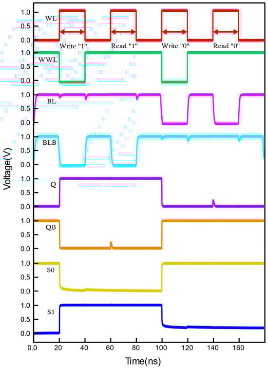 The write operation is initiated by driving WL to VDD and WWL to GND, activating all access transistors (N5, N6, P11, P12). Consider writing a ‘0’ into a cell currently storing ‘1’ (Q = 1, QB = 0), for which BL is driven to GND and BLB to VDD. Node Q is pulled down towards ‘0’ as the active access transistor N6 provides a path to BL (GND). Simultaneously, node QB is pulled up toward ‘1’ as the active write-assist transistor P11 provides a strong path to BLB (VDD). These driving actions through the activated transistors directly force the storage nodes Q and QB to flip their states, thereby completing the write ‘0’ operation. The three operating states—hold, read, and write—are illustrated in the memory operation waveforms shown in Figure 3.