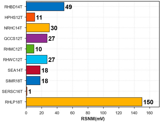 The RSNM is obtained by generating the butterfly curve under read operation conditions (WL = VDD, WWL = VDD, BL/BLB precharged). In the same way as HSNM, RSNM is defined as the side length of the largest square that fits between the curves. Here, the proposed RHLP-18T exhibits an RSNM of 150 mV. This value is significantly higher than those of the compared cells (Figure 6), where the next highest RSNM observed was 49 mV (RHBD14T). This notable improvement in read stability—although potentially contributing to the slower Read Access Time (RAT), discussed in Section 3.2—is a significant advantage for noise-prone environments. The high RSNM appears to result from a combination of factors inherent in the RHLP-18T design: