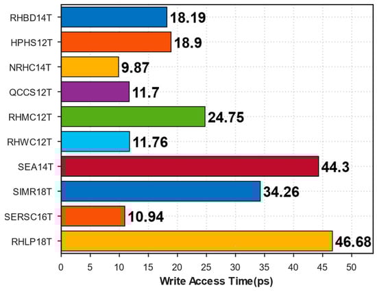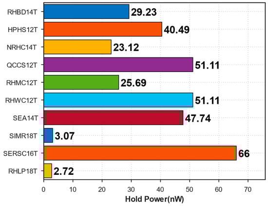 Hold power refers to the static power consumed by the SRAM cell when it remains idle while retaining its stored data (‘0’ or ‘1’). This power drain comes mainly from leakage currents (like subthreshold and gate leakage) flowing through the transistors even when they are technically “off”. Since memory arrays often spend most of their time in this standby state, minimizing hold power is vital for energy efficiency, battery life in portable gadgets, and heat management in dense memory chips. In this area, the proposed RHLP-18T performs exceptionally well. It shows the lowest hold power consumption among all compared cells, just 2.72 nW (Figure 10). This is slightly better than the next lowest, SIMR18T (3.07 nW), and much lower than many others like SERSC16T (66 nW) or QCCS12T (51.11 nW). This extremely low static power is likely attributed to the transistor stacking effect inherent in the cell’s 18T structure. By utilizing a larger number of transistors (18T), multiple series-connected “off” transistors are formed within potential leakage paths during the hold mode. This stacking significantly suppresses subthreshold leakage current, a primary contributor to static power. Consequently, the observed low hold power is a significant advantage, making RHLP-18T very attractive for applications where power is limited.