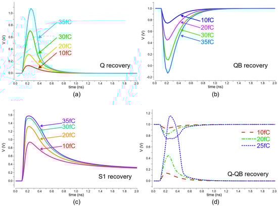 Different amounts of charge (10 to 35 fC) are injected into (a) node Q (b) node QB (c) node S1, and (d) 10 to 25 fC is injected into nodes Q and QB simultaneously.