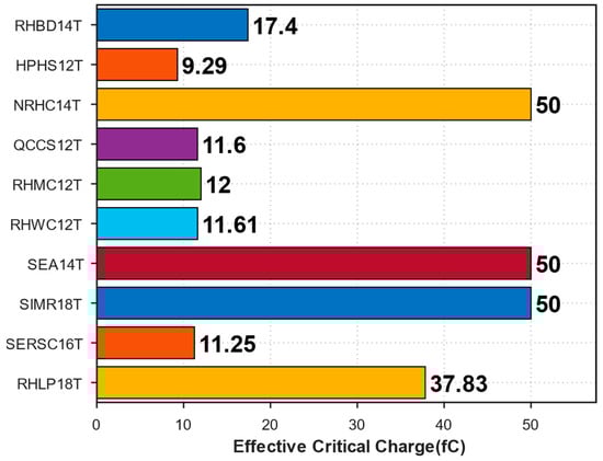 Proposed RHLP-18T cell achieves a critical charge (Qc) of 37.83 fC (Figure 12). While this is not the absolute highest value reported—NRHC14T, SEA14T, and SIMR18T boast Qc > 50 fC—it is considerably better than many other cells, such as HPHS12T (9.29 fC), QCCS12T (11.6 fC), and RHBD14T (17.4 fC). This demonstrates a solid, competitive level of tolerance against SEUs. As mentioned back in Section 2.2, the cell’s defense against certain SEDNUs relies on careful layout design rather than inherent circuit recovery.