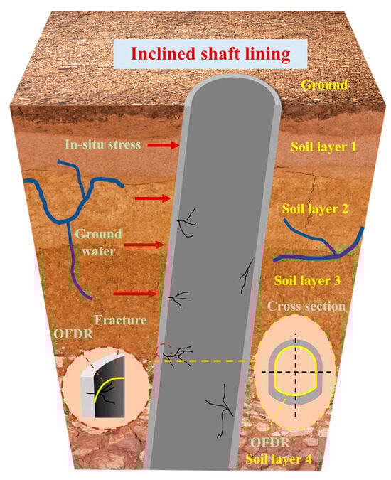 China is characterized by abundant coal reserves but limited oil and natural gas resources, making coal the predominant energy source for the foreseeable future [1]. Shafts serve as critical infrastructure in coal mine construction, primarily constructed as vertical or inclined shafts [2,3,4,5,6]. Among these, inclined shaft mining has played an increasingly vital role in China’s coal extraction and transportation due to its advantages of lower investment costs, faster coal extraction, higher operational efficiency, and reduced production costs [7,8]. However, inclined shafts face significant challenges in weak surface strata or water-rich rock formations characterized by soft lithology and porous water-bearing conditions [9]. During long-term operation, shaft linings are subjected to varying degrees of hydrostatic pressure, with localized water pressure distributions developing around the shaft periphery [10]. Hoek et al. [11] investigated and overcomed the squeezing issues in the La Yacambú-Quíbor Tunnel in Venezuela, analyzed the reason and given the solution. Furthermore, increasing geological complexity at greater depths exposes inclined shaft linings with irregular cross-sections to more complicated external forces. This results in highly complex stress-strain patterns that ultimately lead to lining cracks, water seepage, and potential flooding accidents through groundwater infiltration, posing substantial risks to property and human safety [12]. Application of optical fiber in inclined shaft is shown in Figure 1.