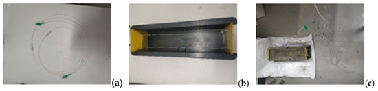 Fiber Embedment Test Procedure: (a) Fiber protection using plastic tubes; (b) Fiber layout configuration; (c) Concrete curing monitoring.