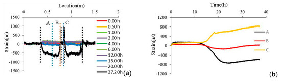 Fiber optic test results: (a) Strain curve of the full-length fiber; (b) Strain variation over time at specific points.