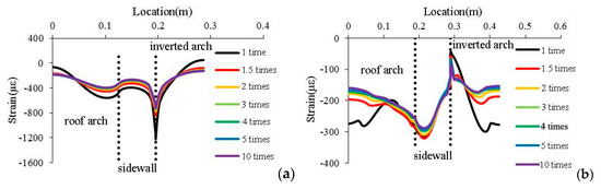 Strain curves at the inner edge of the No. 2 shaft lining: (a) First test group; (b) Second test group.