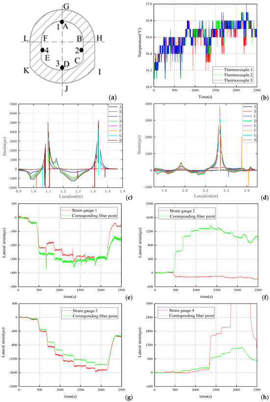Test results for the NO. 1 shaft lining: (a) Key point numbering of the shaft lining model; (b) Temperature variation during the test; (c) Strain curve at the inner edge of the shaft lining; (d) Strain curve at the outer edge of the shaft lining; (e) Comparison of circumferential strain between Strain Gauge 1 and fiber optic measurements; (f) Comparison of circumferential strain between Strain Gauge 2 and fiber optic measurements (crack location); (g) Comparison of circumferential strain between Strain Gauge 3 and fiber optic measurements; (h) Comparison of circumferential strain between Strain Gauge 4 and fiber optic measurements (crack location).