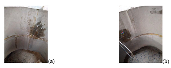The cracking failure mode of shaft lining model: (a) The cracking location near point F on the NO. 1 shaft lining model; (b) The cracking location near point B on the NO. 1 shaft lining model.