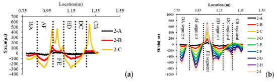 Comparing Figure 6e,g, the measurements from strain gauges and fiber optics showed differences of less than 200 µε in most cases, indicating strong agreement. However, significant discrepancies were observed in Figure 6f,h, especially at crack locations. Specifically, in Figure 6f, the strain gauge and fiber optic measurements exhibited opposite trends. This mismatch likely resulted from fiber slippage at cracked areas, causing deviations between the actual strain values and the measured data. In Figure 6h, after 1200 s, measurement errors between the fiber and strain gauges increased significantly. This suggests that crack propagation caused fiber displacement, reducing data accuracy in later testing stages.