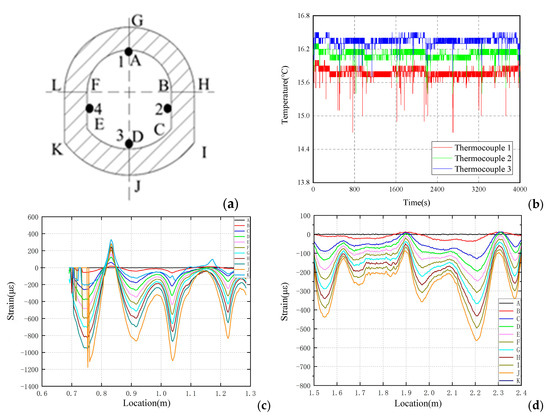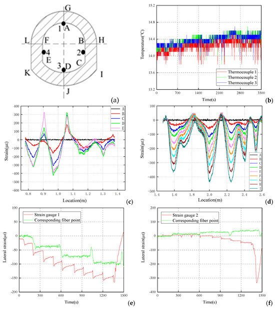 In this test, the circumferential optical fibers were distributed along the inner and outer edges of the shaft lining. The measurement points and test results are shown in Figure 6. As seen in Figure 6b, the temperature variation of the shaft lining model remained within 1 °C throughout the test, indicating a minimal impact on fiber optic measurements (20–30 με). Compared to the overall test data, this temperature effect is negligible. Therefore, temperature fluctuations did not significantly interfere with strain measurements during the experiment.