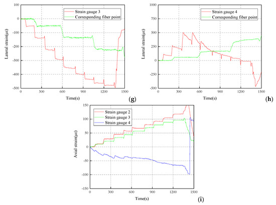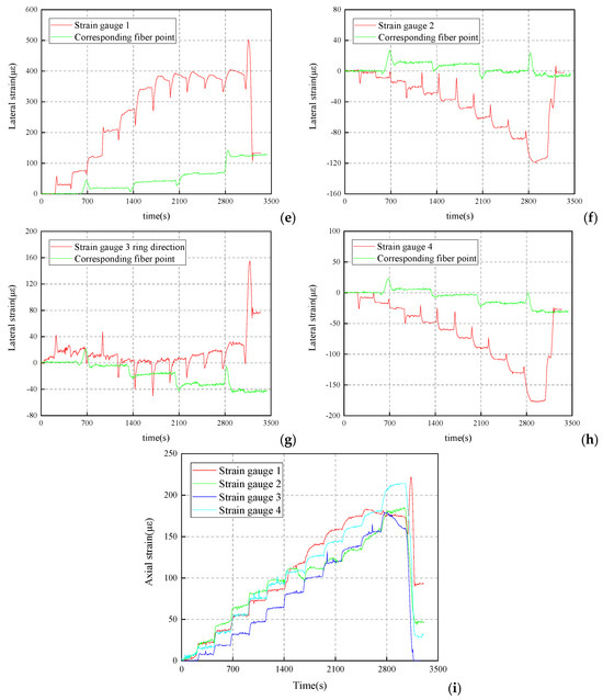 Figure 9e,g show good agreement between fiber optic and strain gauge measurements, with small errors. However, in Figure 9f, the fiber optic measurements slightly exceeded those of the strain gauge. This discrepancy may result from the large spacing between Strain Gauge 2 and the fiber, combined with excessive adhesive, which reduced the strain gauge readings. Figure 9h demonstrates the fiber optic response during shaft lining cracking. After installing PTFE plates, the stress transitioned from tensile to compressive zones. The fiber consistently recorded positive strains, likely due to fiber slippage caused by cracking, indicating reduced accuracy in reflecting actual deformations during this phase. In Figure 9i, the axial strain curve shows values exceeding 110 µε, confirming that the shaft lining behaves under plane stress conditions. The negative values and reverse strain trends in Strain Gauge 4 validate crack formation, aligning with fiber optic data and improving crack location accuracy. These results confirm the effectiveness of fiber optics for strain monitoring in shaft linings, particularly for crack detection. However, factors like cracking-induced fiber slippage may limit accuracy in certain cases.