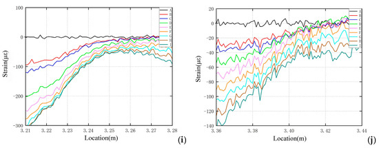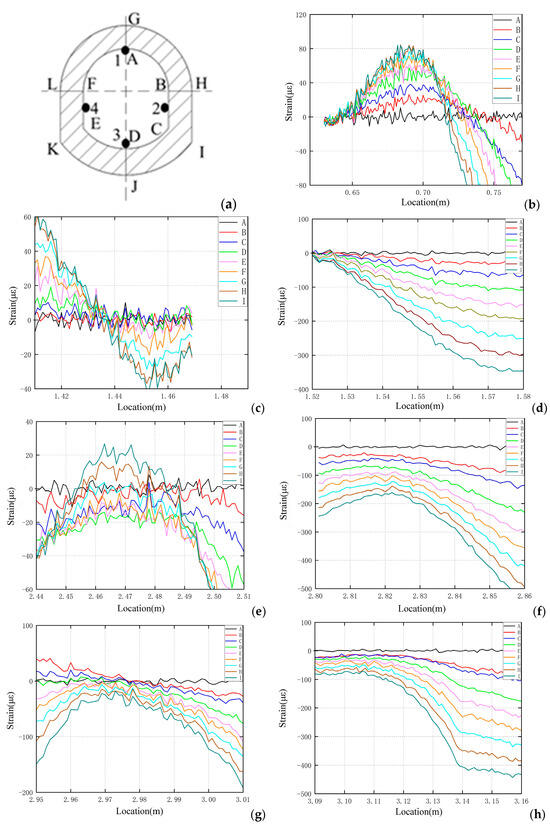 Axial and radial strain curves at different key points during the second loading test of the NO. 2 shaft lining model are shown in Figure 10. According to Figure 10b,e, the axial strain at point b showed tensile behavior, increasing gradually as the test progressed. This aligns with the expected increase in stress at this point during loading. In contrast, Figure 10c,d show compressive strain at point a, which also increased over time. This suggests cracking at point a. However, no tensile strain was detected by the circumferential fiber optics, likely because the cracks did not reach the fiber installation area. For radial strain, Figure 10f–j show compressive strains at all measurement points, which gradually increased with loading. This aligns with the radial compressive deformation of the shaft lining under stress and matches the actual stress distribution during loading. These data agree with theoretical predictions of compressive strain distribution, demonstrating the elastic behavior of the shaft lining under load. Although the fiber optics failed to detect early-stage cracking at point a, changes in axial and radial strains provided critical insights into the shaft lining’s stress state. The progressive increase in radial compressive strain reflects interactions between the shaft lining and surrounding rock, as well as the material’s elastic response. These findings offer empirical support for shaft lining design and crack prediction.